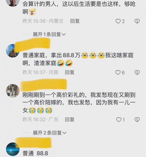 还有网友说,88.8万彩礼外加路虎一辆,你自己说,他是不是曾经救过你命了,现在你要倾其所有啊。