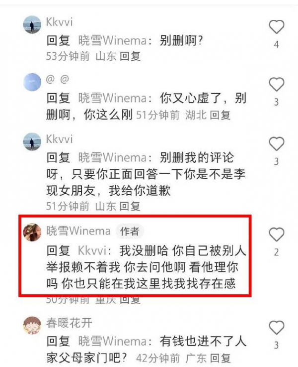 对于网友一再逼问她是否"李现女友",晓雪这样回应,"你去问他啊,看他理你吗?你也只能在我这里,找我找存在感。"