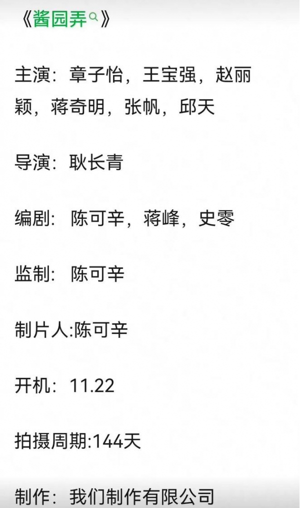 从网友晒出的阵容名单中可以看到,《酱园弄杀夫案》的主演分别是章子怡、王宝强、赵丽颖和蒋启明等人。由此可以看出,赵丽颖将会在影片中担任二番女主,番位仅次于一番女主章子怡和一番男主王宝强。