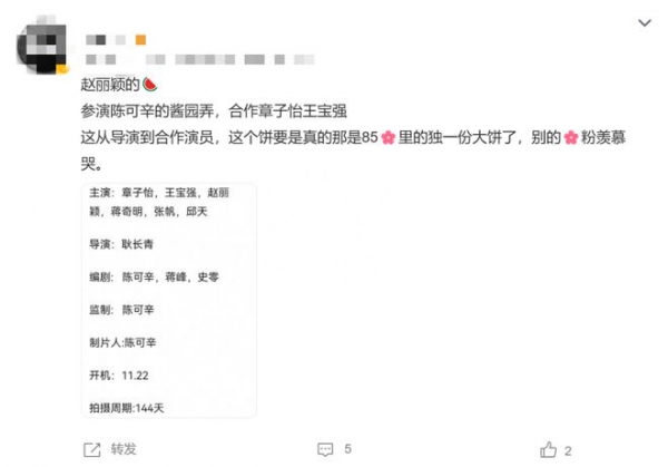 近日,有网友爆料称赵丽颖即将参演陈可辛的新片《酱园弄杀夫案》,与国际影后章子怡、实力派演员王宝强合作。就像网友说的,从导演到合作演员,这个饼要是真的,那是85花里的独一份大饼了,别的花粉要羡慕哭。