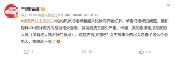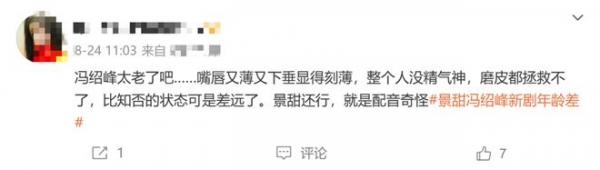 有网友直言"冯绍峰太显老,嘴唇又薄又下垂,整个人没精气神,磨皮都拯救不了,比《知否》的状态可是差远了",还有网友表示"冯绍峰和同样40+的徐海乔同框就格外显老,偏偏磨皮又那么严重"。