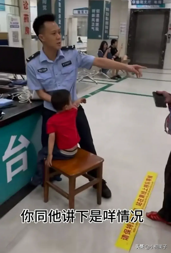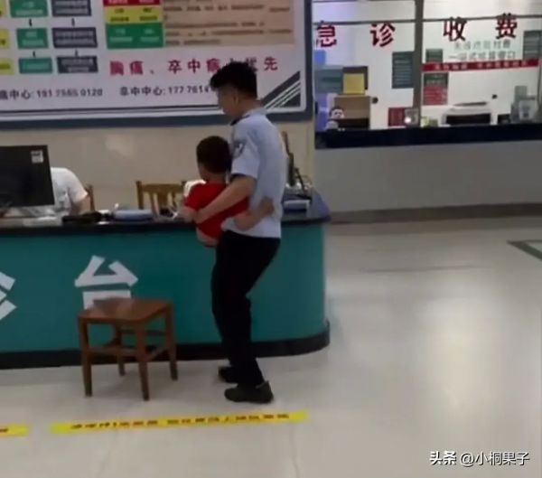 仅用了五分钟就赶到了医院,一位帅气警察小哥抱着小娃快步走进医院。