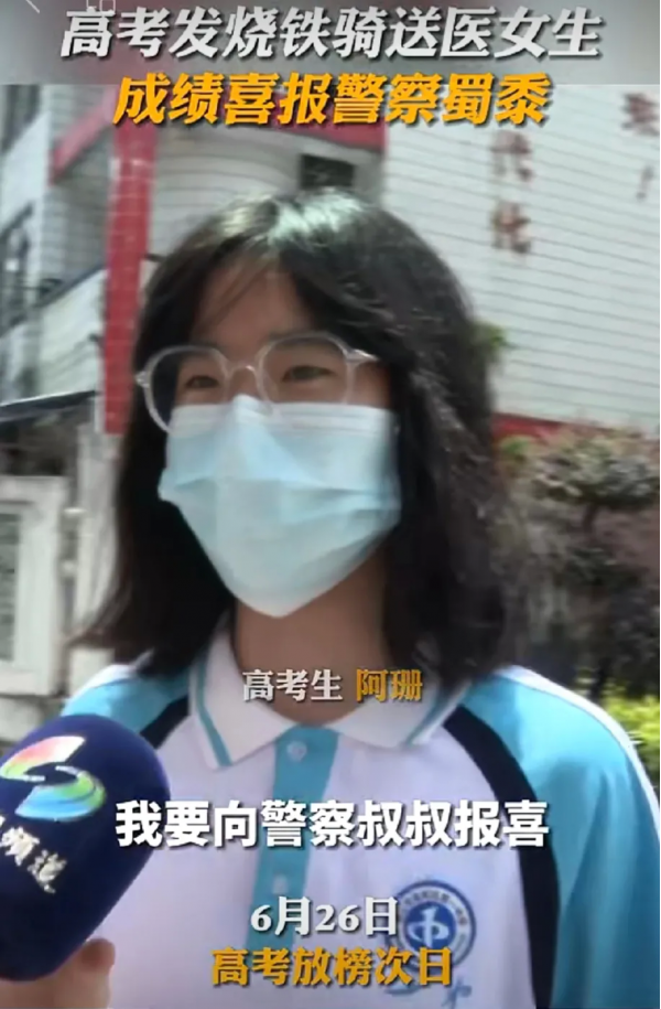 女孩阿姗进考场前,那位警察叔叔又鼓励她说:"听叔叔讲,千万不要紧张,发烧是正常的,等会考完试就没事了,相信我说的,加油!加油啊!"