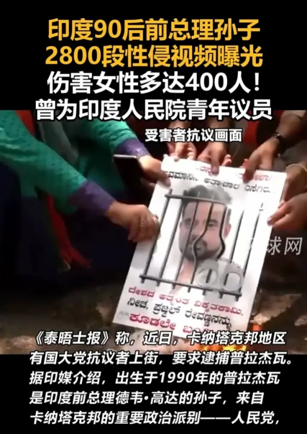 《泰晤士报》称,近日,卡纳塔克邦地区有国大党抗议者上街,要求逮捕普拉杰瓦。据印媒介绍,出生于1990年的普拉杰瓦是印度前总理德韦·高达的孙子,来自卡纳塔克邦的重要政治派别一一人民党。