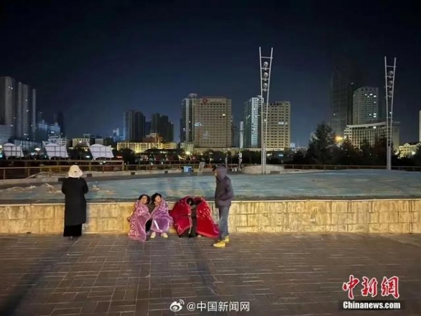 西宁市民裹毛毯在街头避险。图源:中新网