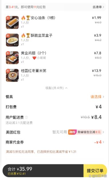 12月18日上午,记者首先进入小李点外卖的那家商户,这家商户主要以粥和生煎类的食物为主。记者选取了一份粥、2个鸡翅、1个韭菜盒子、一根油条。根据平台显示,这单外卖总价35.99元,其中食物27.59元,打包费4元,外卖配送费8.4元。点开打包费详情,记者看到,米粥收了2元打包费,鸡翅收了1元,韭菜盒子收了1元,油条则没有收打包费。