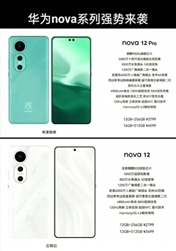 华为nova12:麒麟830芯片,前置60MP超广角自拍镜头,后置50MP+12MP+8MP三摄组合,4800mAh+88W闪充,屏幕采用第二代昆仑玻璃,支持星闪技术,运行HarmonyOS 4.0系统等。