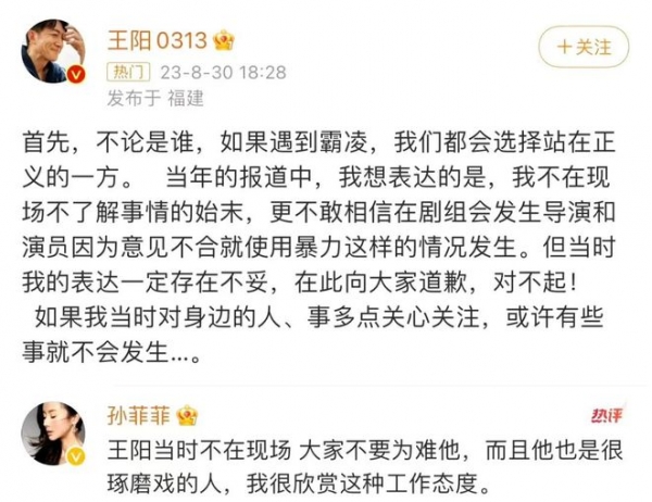 因此很多网友留言"骂"他,王阳也意识到知道自己当时的言语可能不太妥当,便发文道歉,而孙菲菲可能看到王阳被牵扯,在王阳的社交平台下留言让大家不要为难他,维护王阳,还说她很欣赏王阳。