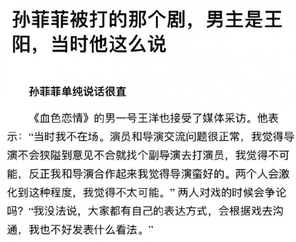 网友开始纷纷谴责当时事件的亲历者,有网友扒出当时男主演王阳曾经回应过这件事,说当时他不在现场,"两个人会激化到这种程度,我觉得不太可能"。