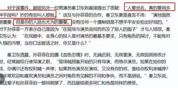 除了王阳,同剧组的秦卫东当年也回应过孙菲菲被打事件,他表示质疑,表示孙菲菲炒作,还说和孙菲菲合作一部戏就够了。