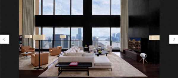 最高档的套房亮点在于外滩江景及天际线景观,酒店提供开夜床服务及管家服务,房间内有一张特大床,带羽绒被,设有办公桌,还有6台电视,面积为393平方米,最多入住3人。