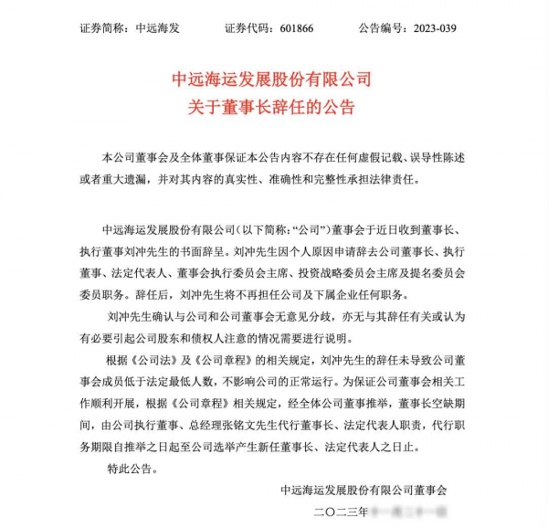 据中远海运发展股份有限公司的公告,刘冲因个人原因辞去公司董事长、执行董事、法定代表人等职务。而公告中提到的"个人原因"究竟包含着什么隐秘的故事,一时间引发了诸多猜测。