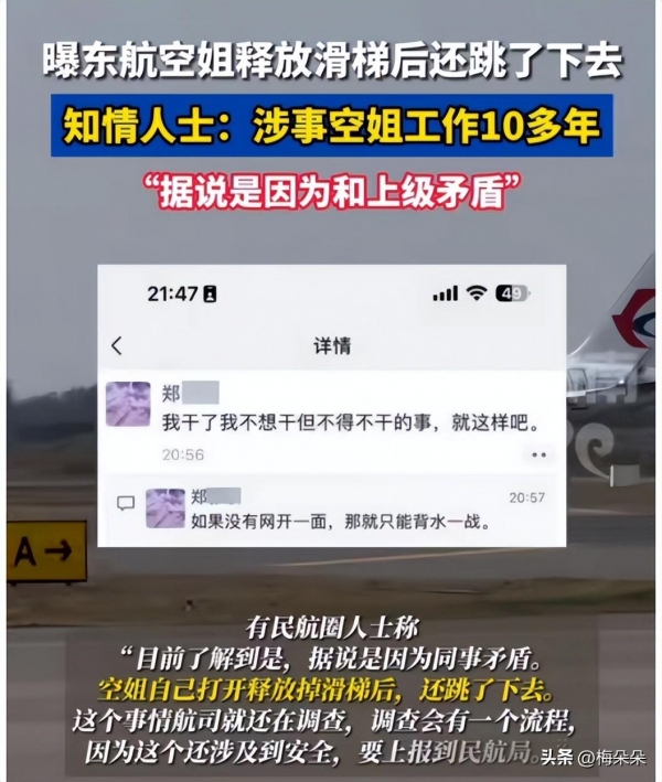 东航空姐因和上级闹矛盾打开客机紧急滑梯?知情人:她已经飞了10年了