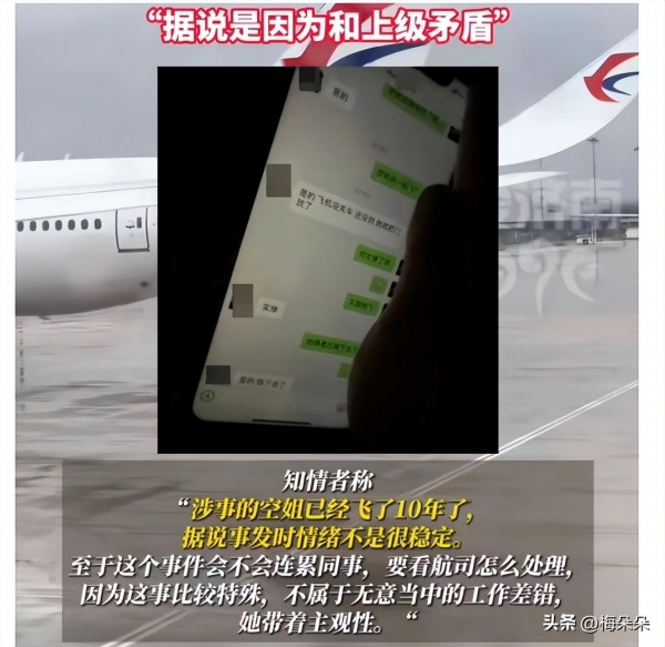 据知情人透露,该涉事空姐姓郑,已经工作10年了,据说是因为和上级有矛盾,事发的时候情绪不是很稳定,至于这个事件会不会连累同事,要看航局怎么处理。