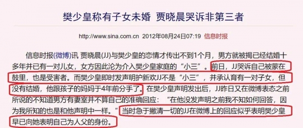 樊少皇回应说确实有子女,但并未结婚,他跟"前女友"早已分手,还强调贾晓晨不是第三者,贾晓晨自己也坚决否认。