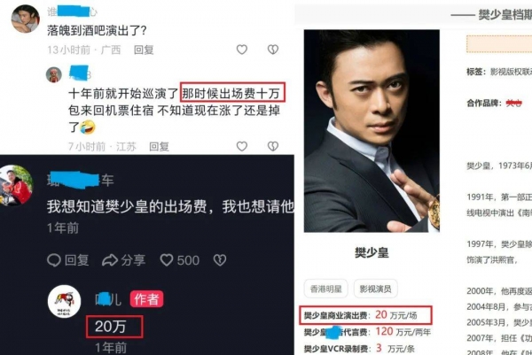 樊少皇好歹是"功夫巨星",出场费没诚意的话是请不动他的,据悉他现在的商演价格是20万一场,是港星中比较高的水平,较十年前已经涨了一倍。