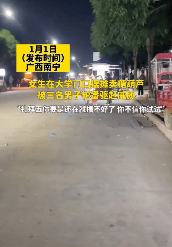 12月30日,广西南宁,一大学女生发布视频称,自己在校门口摆摊卖冰糖葫芦被三名同行壮汉轮番驱赶、威胁:"礼拜五你还在就搞不好了,不信你试试!"