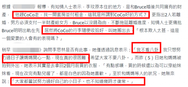 据报道,知情人士表示,李玟原本住的地方是和Bruce婚后共同拥有的财产,但Bruce将李玟"赶走",他为何要出钱给女方租房子,是想要她快点离开。