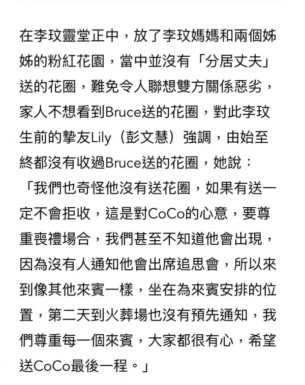 Bruce花了不少心思,花圈颜色是李玟最爱的白色跟紫色,爱心形状代表家人的爱,他在花圈上以英文写着"我们会永远爱李玟",署名是他跟两个女儿。