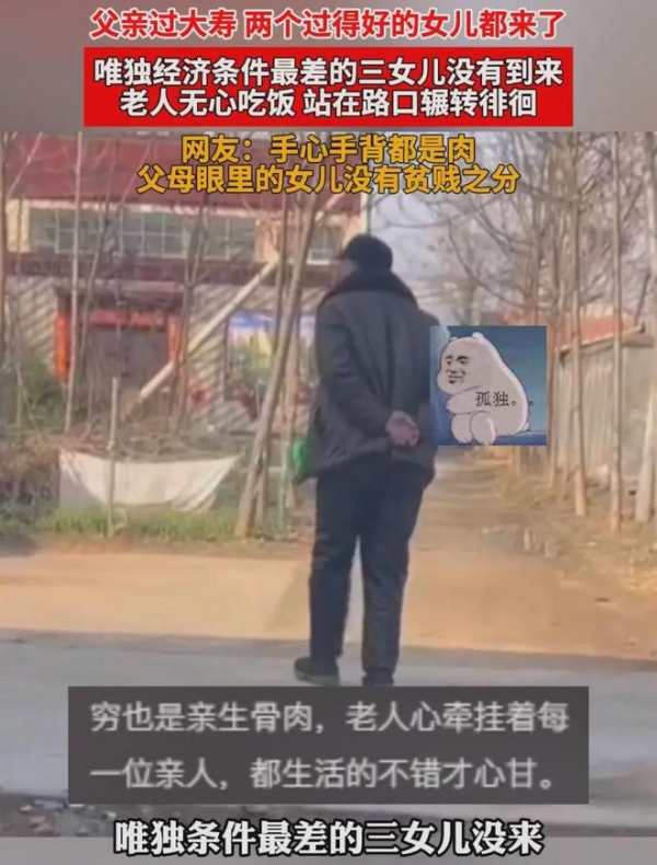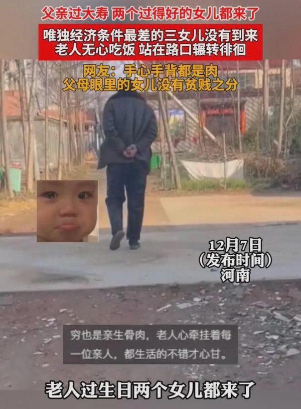 近日,一女子分享,父亲过生日,妹妹因为条件不好没有回来,父亲一直在门口徘徊的一幕引发关注。网友说,很理解这位父亲的心情。