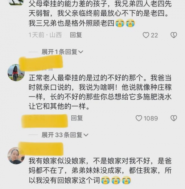 对于女子的分享,网友都表示理解,有网友说,父母都是这样,最牵挂的是过的不好的那个。我爸当时就亲口说过这话,我说为啥啊!他说就像种庄稼一样,长的不好的那些你总想给它多施肥浇水,想让它长得和其它的一样。