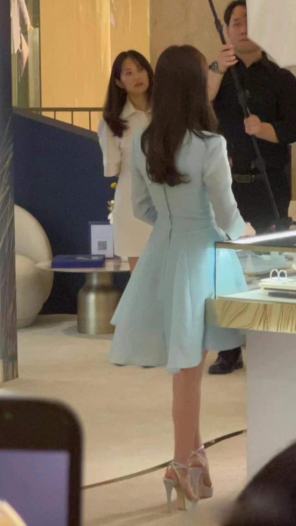 搭配上,防水台高度亮钻款凉鞋,抬高身材比例线条,和淡蓝色长裙的风格搭配也十分吻合,营造夏日清爽的浪漫与优雅;发尾微卷的中分披肩发,韩式氛围感满满,显得宋慧乔既温婉又秀气。