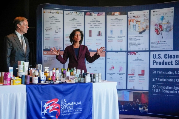 8月28日,雷蒙多和美国驻华大使伯恩斯在北京参观面向中国市场的美国美容保健产品展示会。图片来源:视觉中国