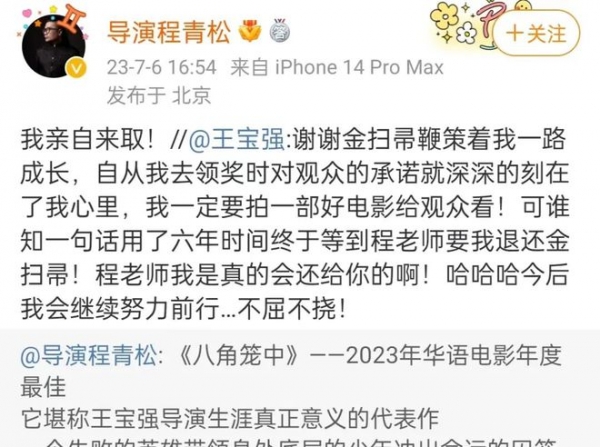 对于程青松的喊话,王宝强的回复很真诚,他没有因为电影的大火就焦躁,始终保持真诚,称感谢金扫帚对他的鞭策,今后会继续前行。程青松直言,他会亲自取回金扫帚。