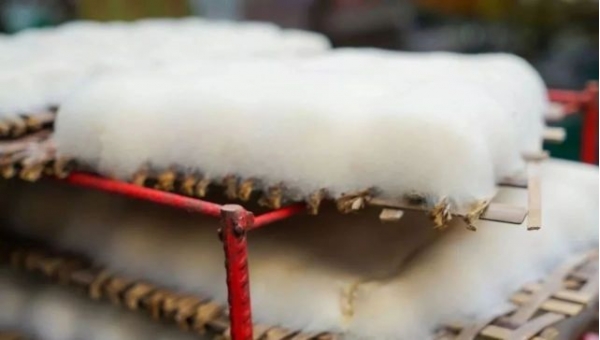霉千张的制作有两个重要环节,一个便是千张的制作,另一个则是发酵的过程。首先挑选优质的黄豆将其磨成浆汁后用盐卤打花,随后将其倒在铺好的土粗布上压干水分,做成千层衣,再将千层衣切成长方形的小条之后,霉千张的主要部分千张就制作完成了。