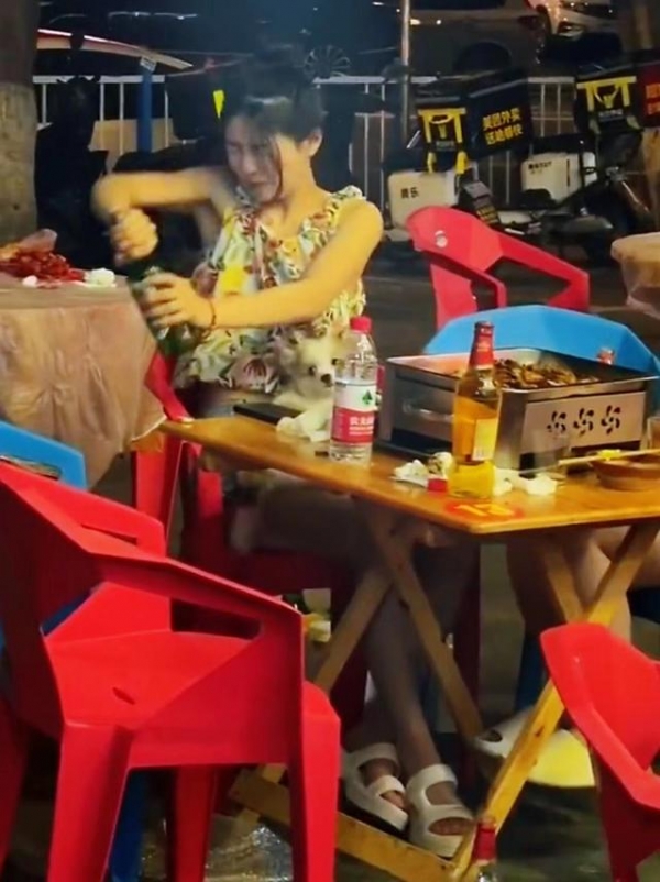 两名女子应该比较熟悉,或者是闺蜜那种关系。为了助兴,她们还旁若无人地划起了拳,说好了,谁输了谁就喝一杯啤酒。