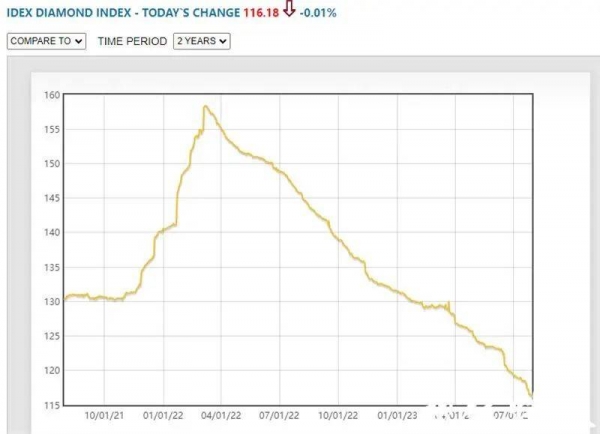 国际钻石交易所(IDEX)官网最新价格指数显示,7月30日INDEX钻石指数报116.18,较2022年3月7日158.39的峰值下跌了约26.65%,至今已连续下滑十几个月。