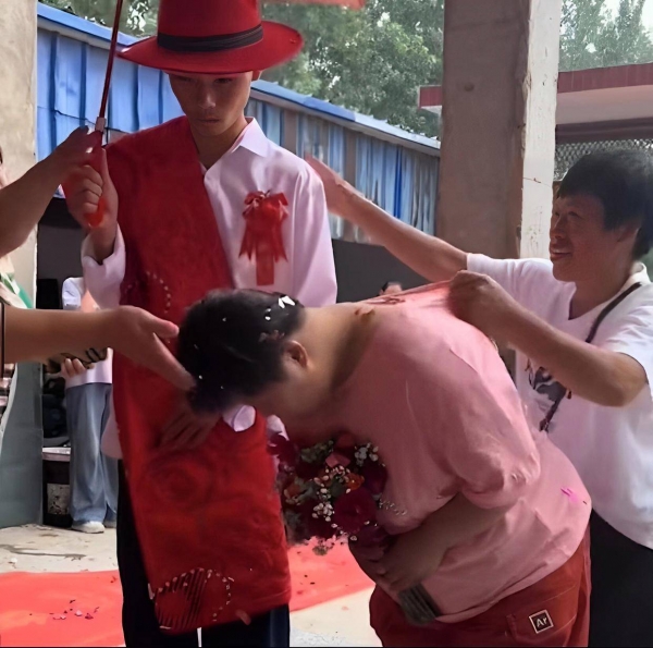院子里的亲友们不住地欢笑,看着两个人面无表情,好像不知道在做什么,这时一位穿着白色T恤的中年妇女,从旁边走过来,出其不意双手按下两人的肩头,示意新郎新娘赶快拜堂。