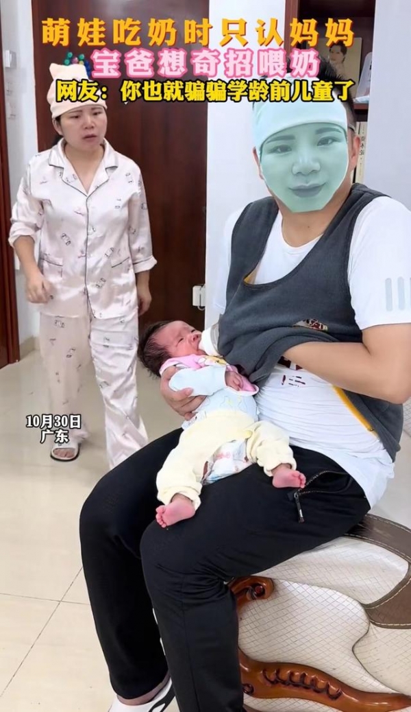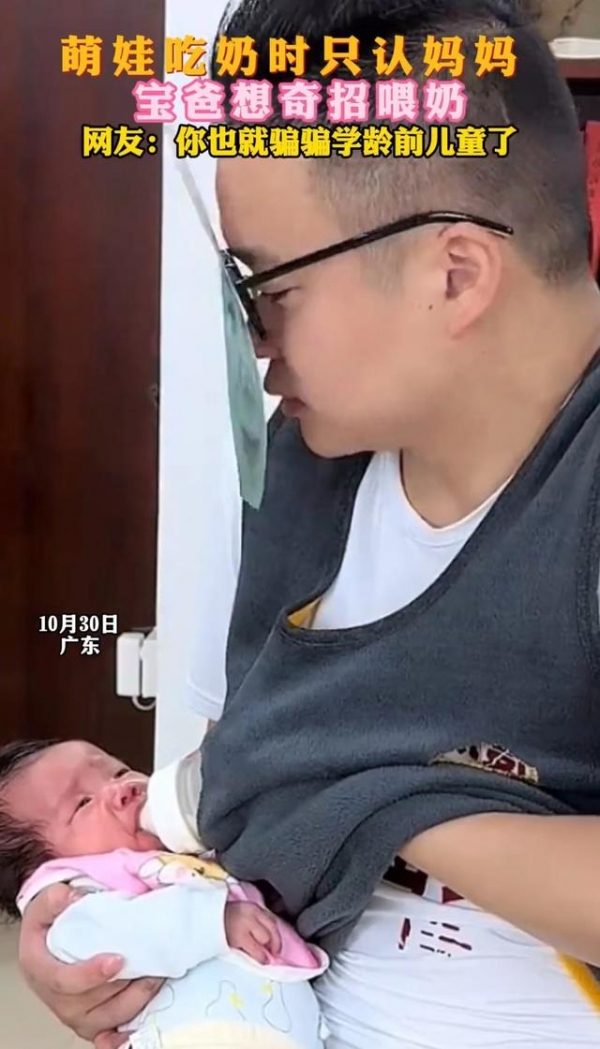 无奈之下老公想到一个主意,将老婆的照片裁剪下来贴在自己眼镜上,这样孩子就只能看到妈妈的照片,看不到正在给自己喂奶的是爸爸了。