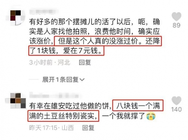 更难能可贵的是,走红之后,粥饼伦的灌饼不但没涨价,还从8块降到了7块,就为了呼应一句"爱在七元钱"。