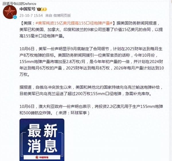 对于乌克兰这样的国家来说,这种炮弹是非常重要的,因为它能够帮助他们在战场上获得优势。但是,对于美国来说,这种炮弹也非常重要。毕竟,美国在全球范围内都有军事存在,他们需要拥有高效的武器系统来保持自己的利益和地位。这也是为什么美国陆军会提供15亿美元的合同,以提高全球155毫米炮弹产量的原因。总之,这种炮弹已经成为乌克兰战争中的一种重要武器,并且在未来几年内将继续得到重视。随着美国陆军加紧生产,这种炮弹将成为全球军队中的主要武器系统之一。
