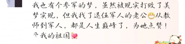 有人感慨: 我也有个参军的梦,虽然被现实打败了美梦实现,但我找了退伍军人的老公[嘻嘻]从教师到军人,都是人生巅峰了,为她点赞!