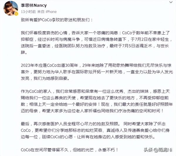 刘雅瑟:我真的疯掉!!!coco姐,6月25号你还说,有机会我们要见面的啊。怎么会这样?怎么会???!我真的不愿意相信,但愿你在另外一个世界安好。