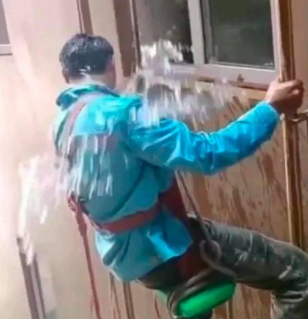 云南保山的一名工人在一小区悬挂在楼房外维修天然气管道时,被一住户泼水16次,还被其使用木质锅铲捅。