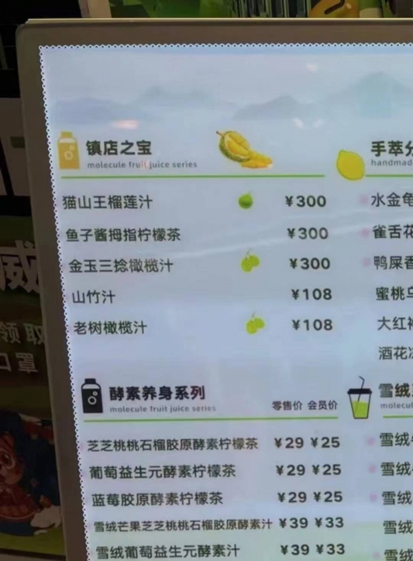 11月15日,九派新闻联系该品牌的港汇恒隆广场店,工作人员称店内确实有300元一杯的猫山王榴莲汁,食材猫山王榴莲采用的是进口的更高级的榴莲,几百块一斤的那种。他表示,300元一杯的饮料只能在到店里买,制作需要一二十分钟,"也会有人买,但是不多。"