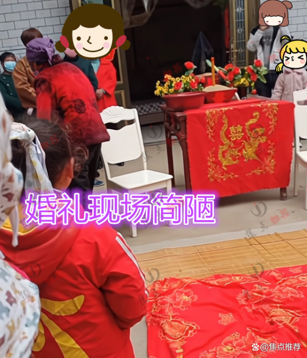 周围为了几个老人孩子,应该是双方的亲友,在两人面前还摆了香案,应该是拜天地的流程,两人在跪拜天地之后,就算结婚了,这家人如此简单地就举办了婚礼,让人觉得有点寒酸。