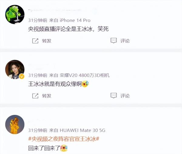 对于王冰冰的首秀表现,网友的反馈也都很不错,特别是看到她的介绍依旧带着"总台"二字,更是放下心来,这里也是很欣慰王冰冰并没有因为私生活影响事业,实际上,自从误会解除之后,大部分网友都期待着王冰冰能早日回归,这一点从王冰冰最新一条微博的数据就能有所体现。