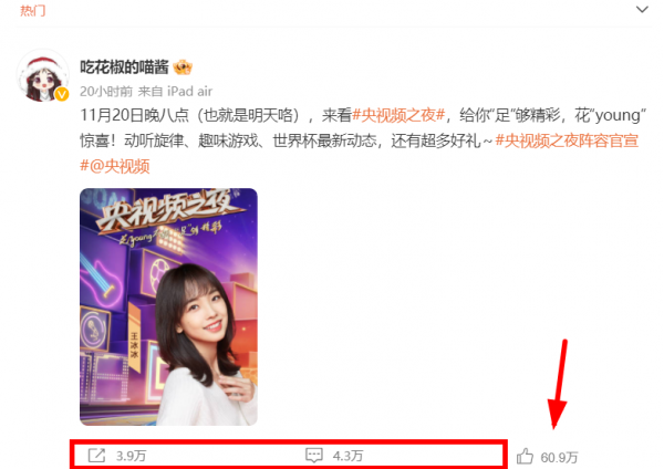 不过是一条简单的宣传微博,不到24小时时间,王冰冰就获得了3.9万转发、4.3万评论以及超60万点赞。