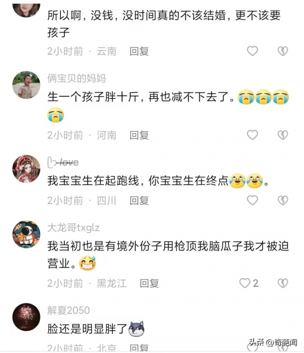 也有网友评论说,人家生孩子就是去医院卸个货,身材一点没变 ,我生了孩子成了猪八戒一直到老。