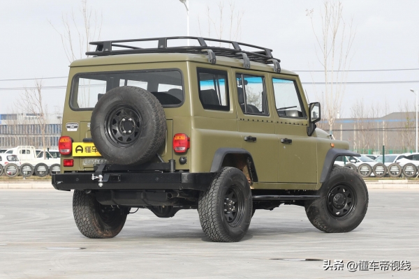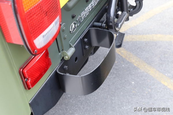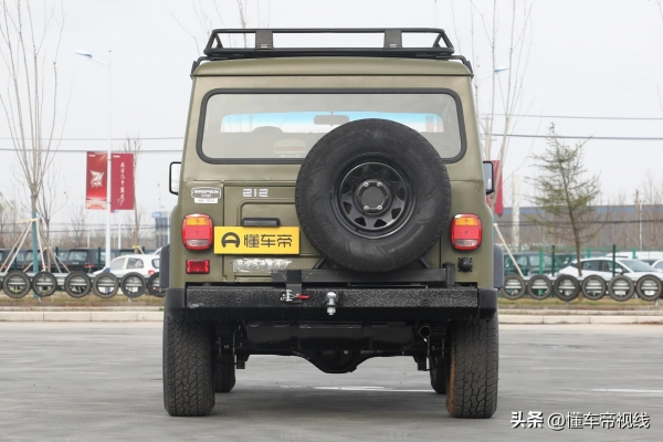 在尾部方面,新款BJ 212整体布局并未调整,依然采用外挂式备胎、下翻式后备厢盖和独立式后备厢设计,并取消了现款车型配备的后保险杠双缓冲环。作为全新调整,新车换装平开式两点下部固定备胎架,该备胎架带有气弹簧液压杆。此外,该车配备倒车雷达、拖车钩和后部取电口,这表明新款BJ 212或具备原厂拖车资质。