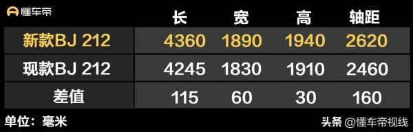 尽管外观看似变动不大,不过作为新款BJ 212的主要升级,该车将前轴位置进行前移,这样的调整不仅使轴距增加,其接近角也从45度提高到47度(离去角继续为35度,最小离地间隙为245毫米)。同时,随着新款BJ 212前轴位置更加靠前,预计新车前部重心也将同步发生变化,对于越野过程中的稳定性或许相比老款车型将会改变。