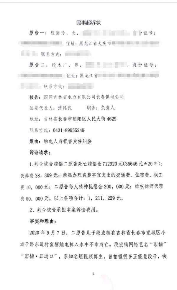 今年10月,段宏楠的父母起诉国网吉林省电力有限公司长春供电公司(以下简称长春供电公司),案由为触电人身损害责任纠纷,索赔死亡赔偿金和精神抚慰金等共计121万余元。目前,长春市朝阳区法院已受案。