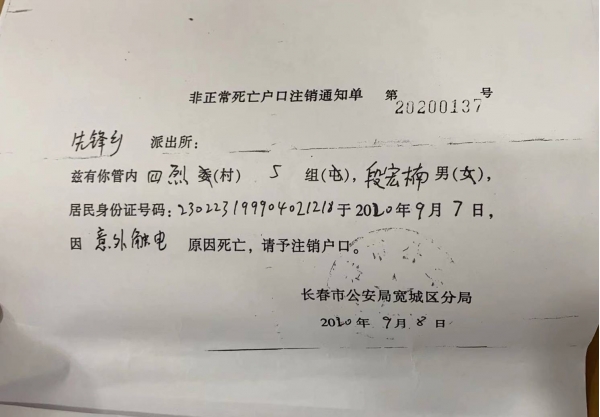 ▲长春市公安局宽城区分局出具的《非正常死亡户口注销通知单》显示,段宏楠因意外触电死亡