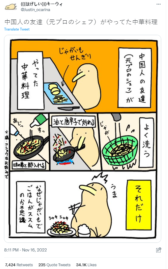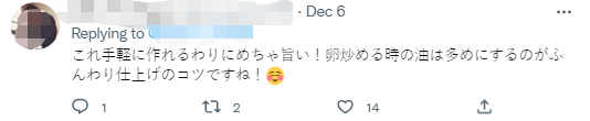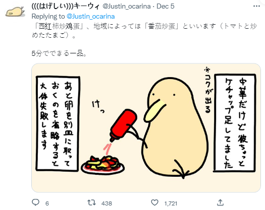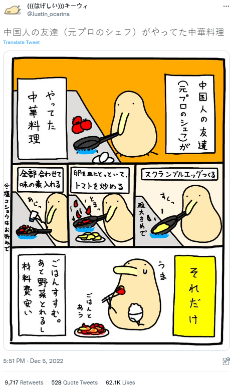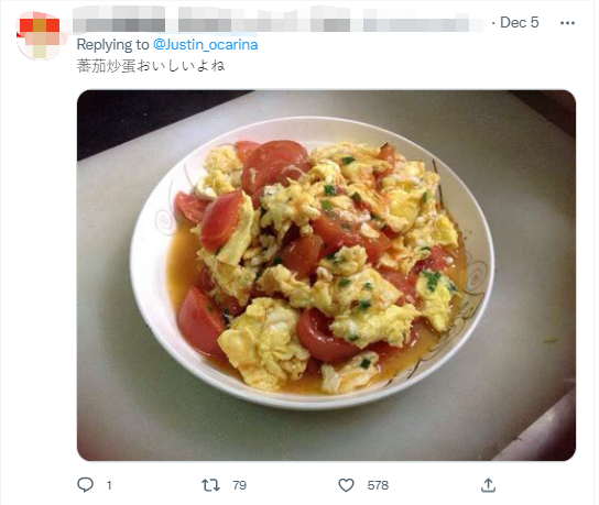 12月5日起,日本推特用户绘制的一张记录西红柿炒鸡蛋做法的漫画成为热帖,发布人称,这是当过厨师的中国朋友教他的菜,简单便宜又下饭。两天不到,该条推特获得了6.2万点赞和近万次转发,评论区众多日本网民交流炒这道菜的心得,感叹中餐真是好做又美味。