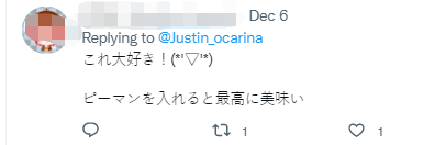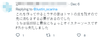 12月5日,Justin在推特发布了介绍西红柿炒鸡蛋的漫画,配文称这是"中国朋友(前专业厨师)做的中国菜",并在评论区补充道,该菜也被称为"番茄炒蛋",是道"5分钟就能完成的菜品"。