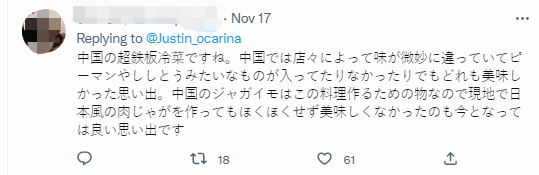 日本网民还留言称,每家店炒的酸辣土豆丝都很好吃,只是味道略有不同,随后话锋一转,竟声称中国的土豆就是用来炒土豆丝的,所以在中国做"日式土豆炖肉"不好吃。有没有想过可能是厨艺的问题呢。